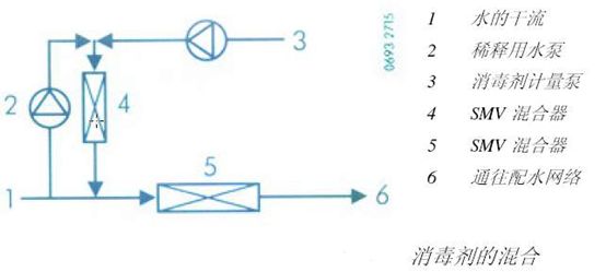 次氯酸钠在水溶液中离解成HOCl 和OCl - 离子,即有效游离氯,其中HOCl 起主要杀菌作用。处理后的中水中残留的有机物与有效氯生成的化合物无杀菌能力。为了充分发挥HOCl 的杀菌作用,要求在加次氯酸钠后HOCl 尚未与有机物反应之前,在几秒时间内迅速完成杀菌作用。中水处理后投加次氯酸钠消毒时,快速混合接触极为重要。